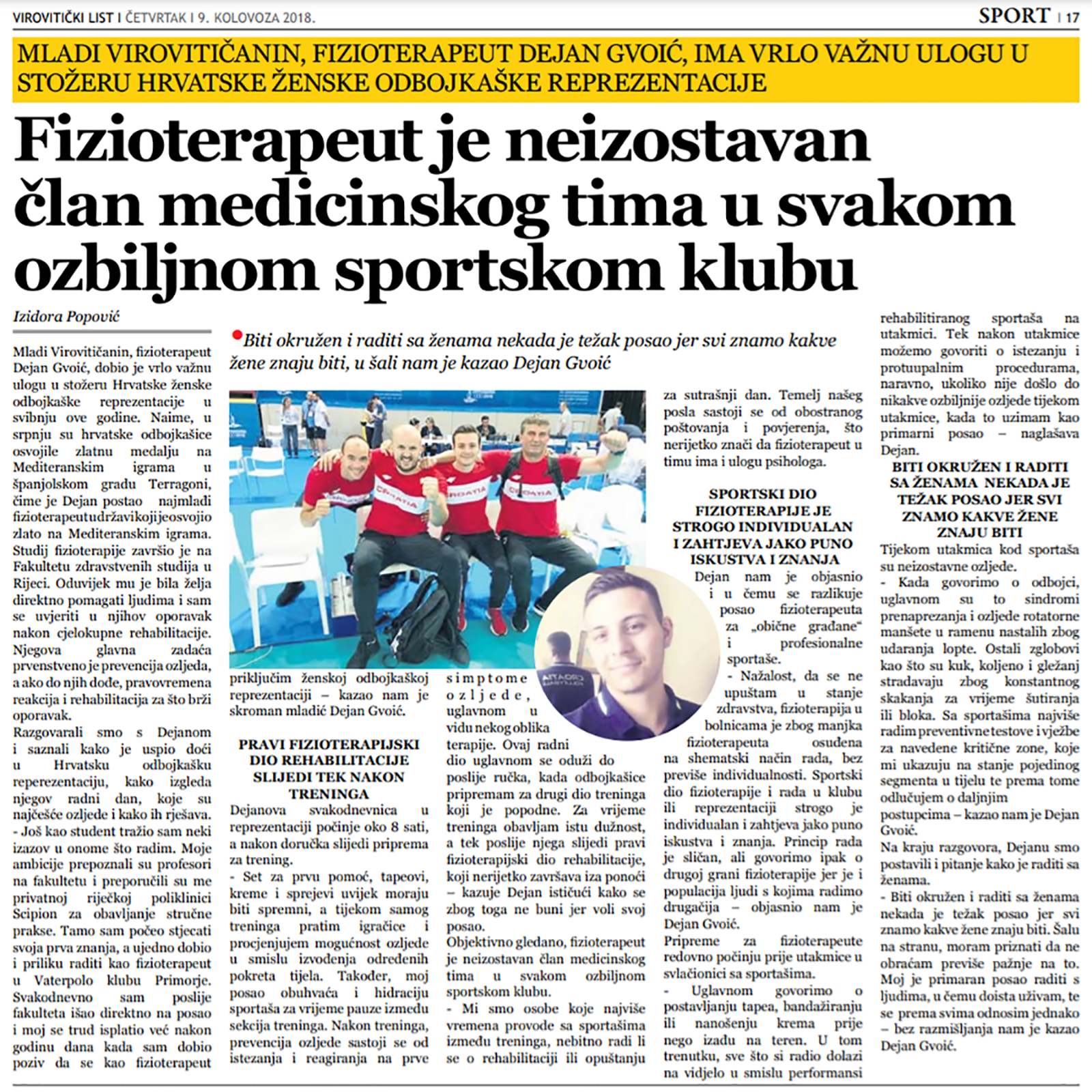 Nadalje, moje zalaganje i rad na području fizioterapije bili su prepoznati u vidu poziva Hrvatskog odbojkaškog saveza kao službenog fizioterapeuta za žensku seniorsku reprezentaciju Hrvatske. U radu sa odbojkaškom reprezentacijom na Mediteranskim igrama u Tarragoni 2018. godine proglašen sam najmlađim fizioterapeutom koji je osvojio Mediteransko zlato.